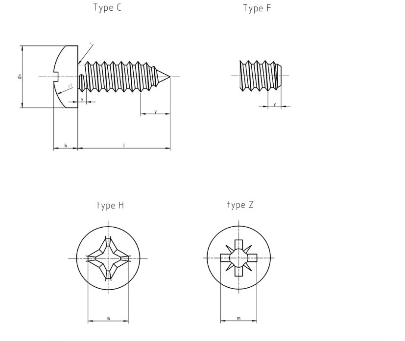 DIN 7981 defines cross-recessed pan head self-tapping screws with thread-forming “Type C” geometry. These screws cut their own mating threads into sheet metals, plastics, and light alloys, eliminating the need for pre-tapped holes.